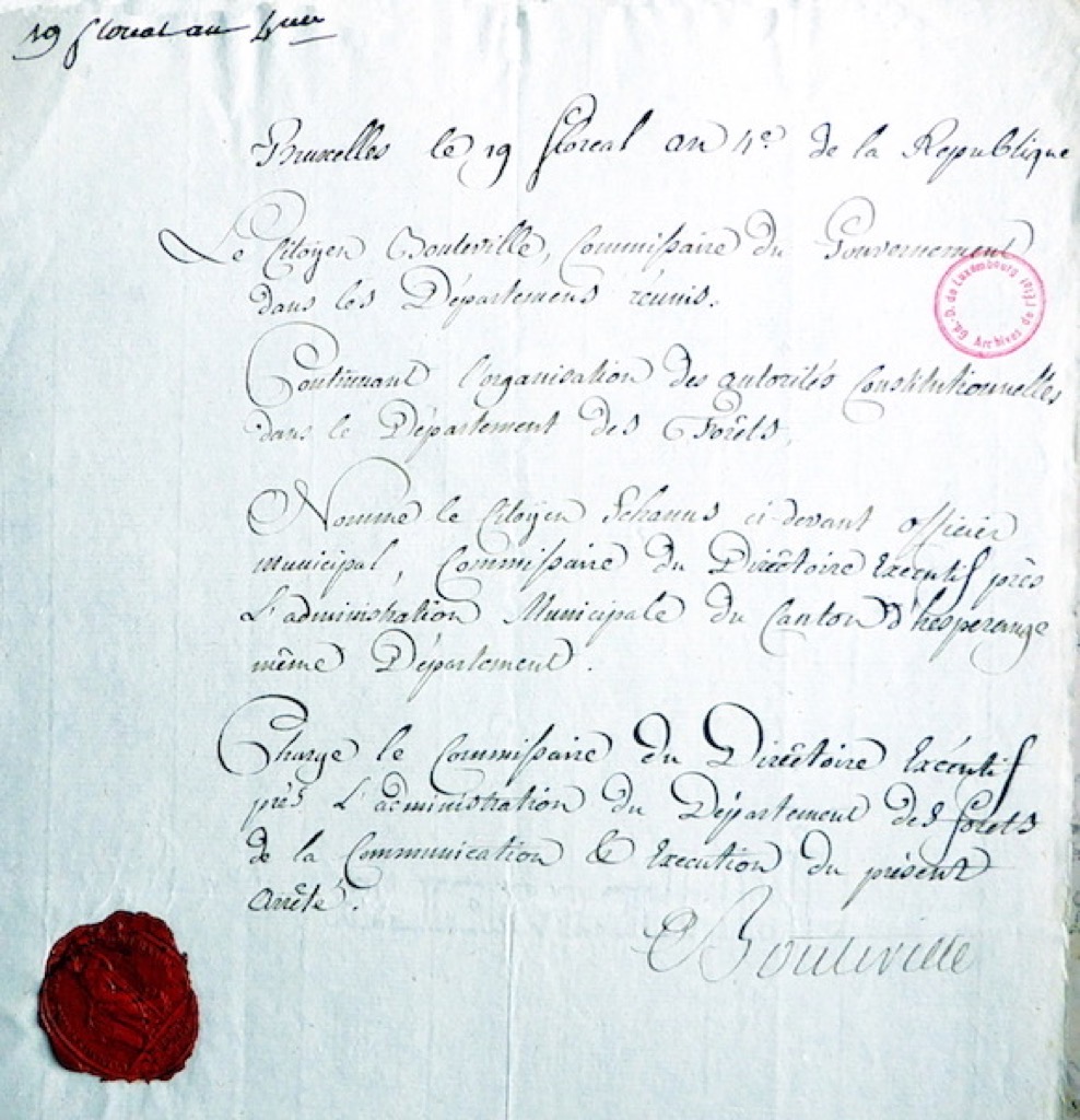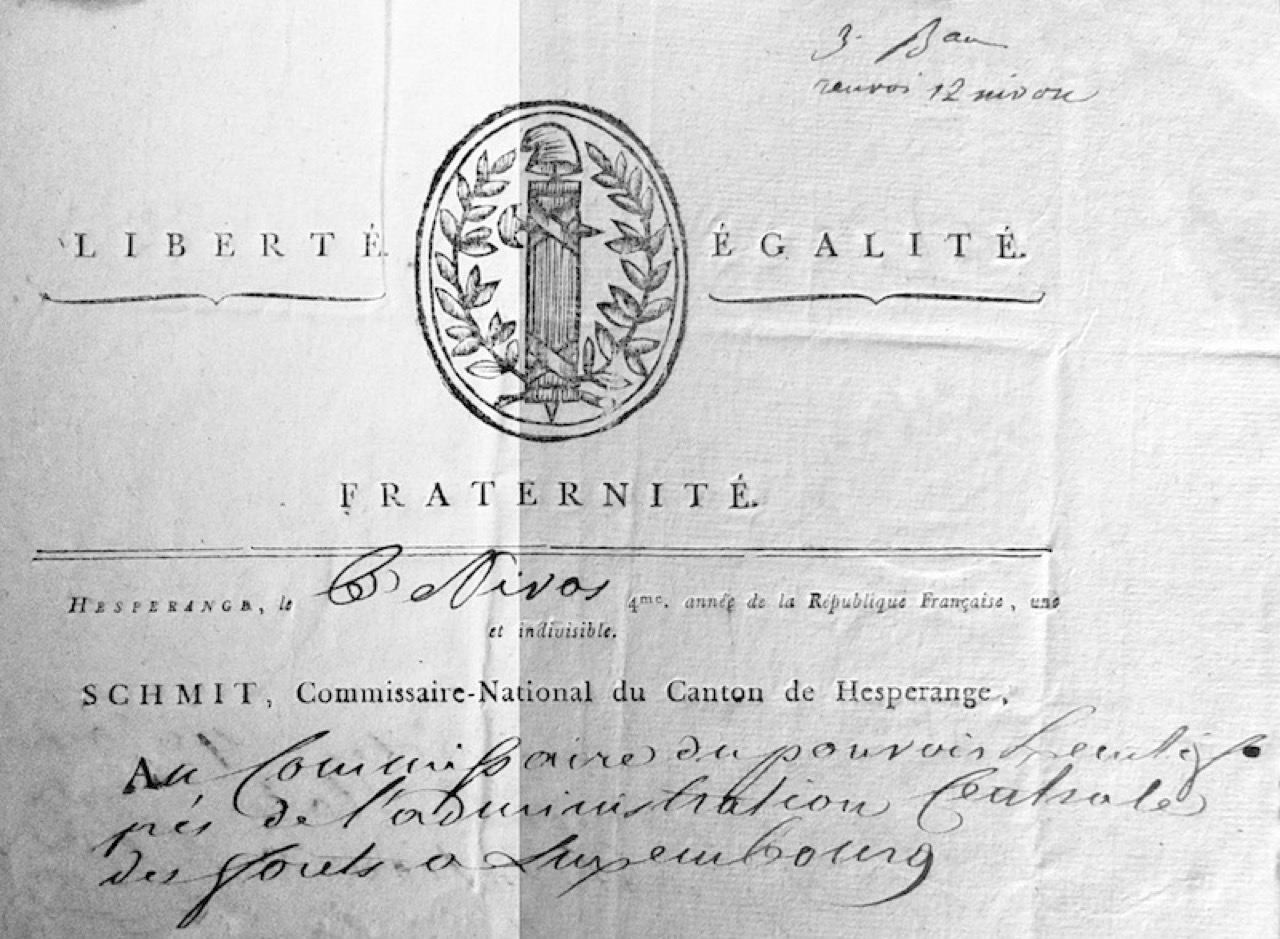 Tatsächlich war Hesperingen einmal Kantonalhauptort und dies von 1795 – 1802 unter der französischen Herrschaft. Während der Anfangszeit wurde noch nichts an der alten Ordnung verändert, aber nach dem Sieg der Franzosen und dem Abmarsch der letzten österreichischen Truppen (12.06.1795) erfolgte eine neue Verwaltungsordnung für das alte Herzogtum Luxemburg und die Grafschaft Chiny, wobei man bemüht war, die Grenzen der alten Propsteien und Herrschaften bei der Bildung der Kantone nach Möglichkeit zu berücksichtigen. Im Wälderdepartement bildeten die gewählten Agenten des Kantons die Munizipalverwaltung. Mehrere Versuche, neu geschaffene Kantonalverwaltungen mit Friedensgerichten anstelle der alten Gerichte zu bilden, gipfelten schließlich in einer Neueinteilung mit 26 Kantonen und am 11.08.1795 dann wurde zusätzlich der „canton appelé vulgairement banlieu de Luxembourg“ in deren zwei aufgeteilt: der östliche Teil („Levant“) mit Hesperingen als Hauptort und der westliche („Couchant“) mit Mersch als Kantonalhauptort. François Bockholtz wurde am selben Tag als Friedensrichter in Hesperingen ernannt (mit Sitz in Biwingen) und Jean-Pierre Nothomb zum Gerichtsschreiber („greffier“).