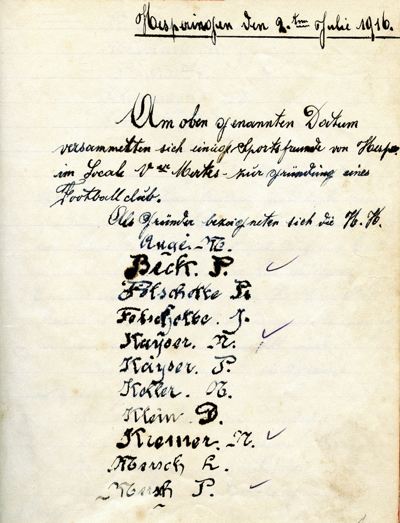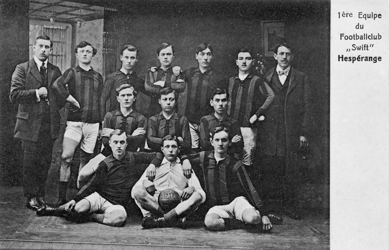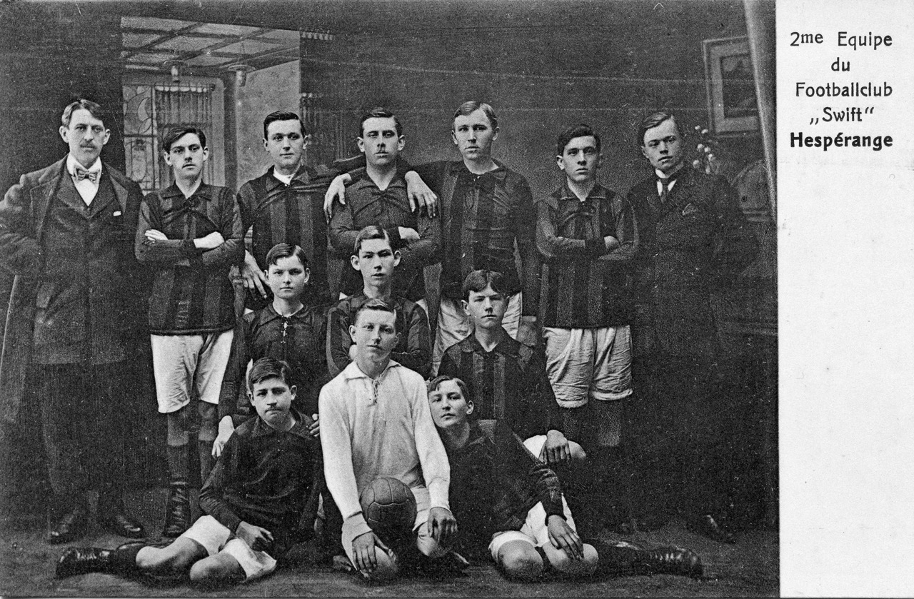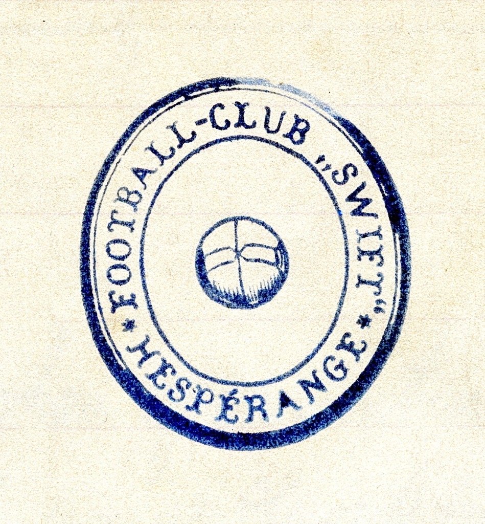Tatsächlich haben sich am 02.07.1916 einige sportbegeisterte junge Burschen zusammengefunden und den „Football-Club Swift Hespérange“ aus der Taufe gehoben. Erst ab der zweiten Hälfte des 19. Jahrhunderts wurden erste Sportvereine in Luxemburg gegründet und eine erste Luxemburger Fußballmeisterschaft (mit insgesamt 9 Mannschaften) wurde gar erst im Jahre 1908 ausgetragen. Trotz der Kriegswirren in den Jahren 1914-1918 ruhte der Fußballsport nur kurze Zeit, denn „déi englesch Kränkt“ hatte mittlerweile das ganze Land erfasst. So hatten auch die ersten Vereinsnamen englische Wurzeln wie etwa „Sporting“, „Racing“ oder Young Boys. Der Hesperinger Verein gab sich den Namen Swift, was so viel wie „schnell“, „flink“ oder „rasant“ bedeutet.